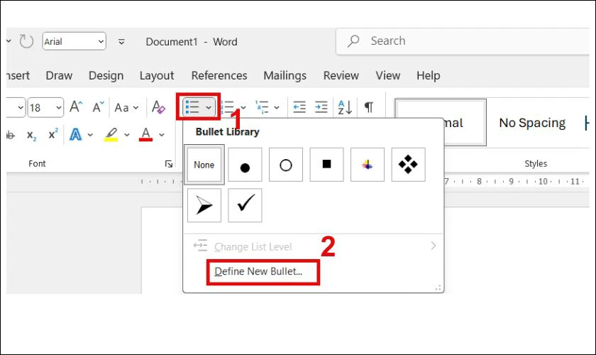 Bước 1: Vào Home. Sau đó chọn Bullets (biểu tượng danh sách). Chọn Define New Bullet.