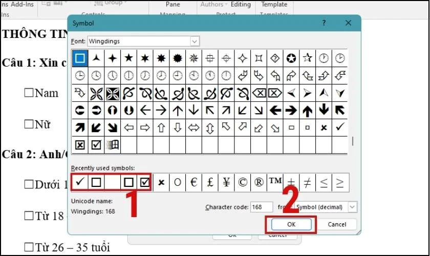 Bước 3: Khi bảng Symbol xuất hiện, chọn biểu tượng dấu tích bạn muốn sử dụng, sau đó nhấn OK. Cuối cùng, nhấp chuột vào ô Check Box để kiểm tra kết quả.